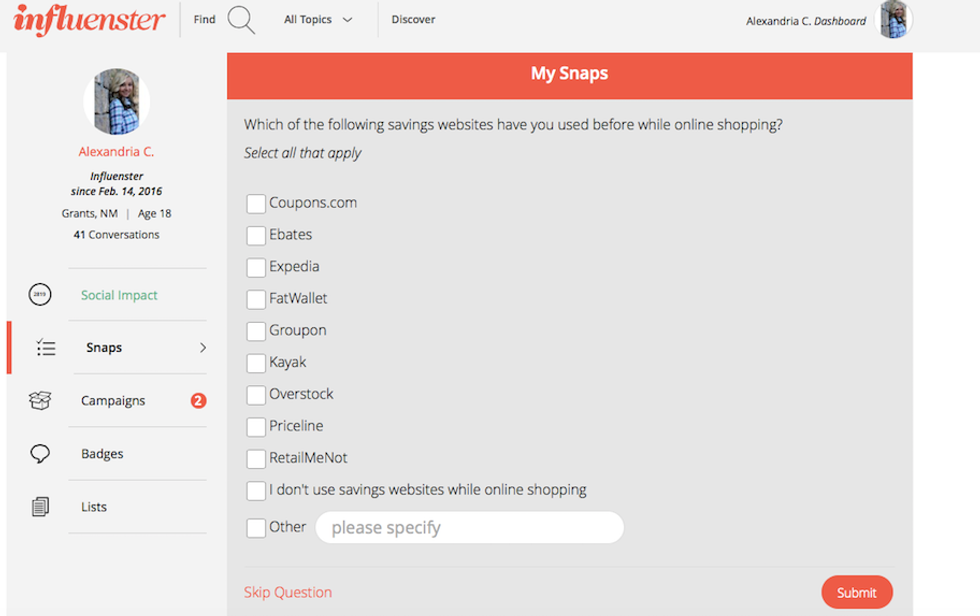 Snaps are questions Influenster asks you about your former experience with different products. They ask things such as "what facial cleansers have you used in the last six months?" or "do you have animals?" and they use your answers to come up with products you may have tried. Plus, by answering these snaps, you get extra points toward different badges that those products are listed under!