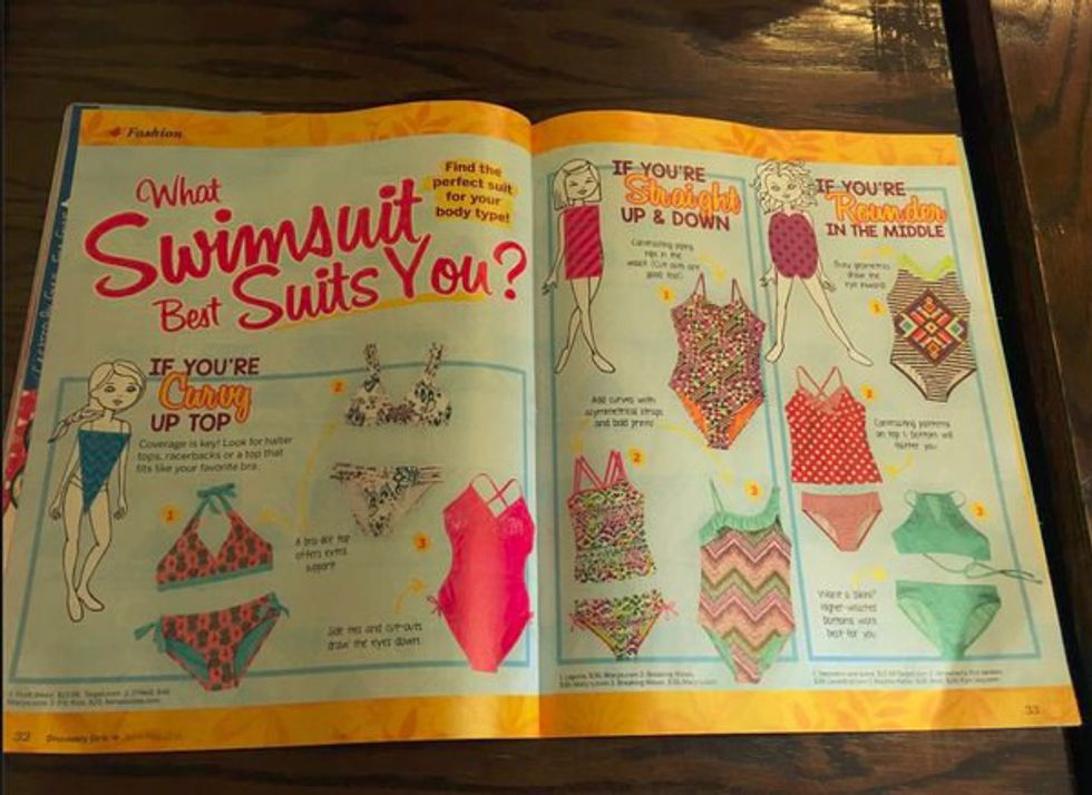 And where did these insecurities come from? When did we start comparing ourselves to everyone else? Who woke up one day and decided that there was a certain mold that every girl needed to fit into? Recently, Discovery Girls magazine, a publication targeted towards girls aged 8-13, ran a two-page feature titled "What Swimsuit Best Suits You?" The brightly colored spread asks the young readers to decide whether they're "straight up and down", "curvy on top" or "rounder in the middle" and pick a swimsuit that would best hide their flaws. As you can imagine, this feature drew a lot of criticism. Already at the age of 8, young girls are being asked to evaluate their bodies and start to see that there might be something wrong with them.