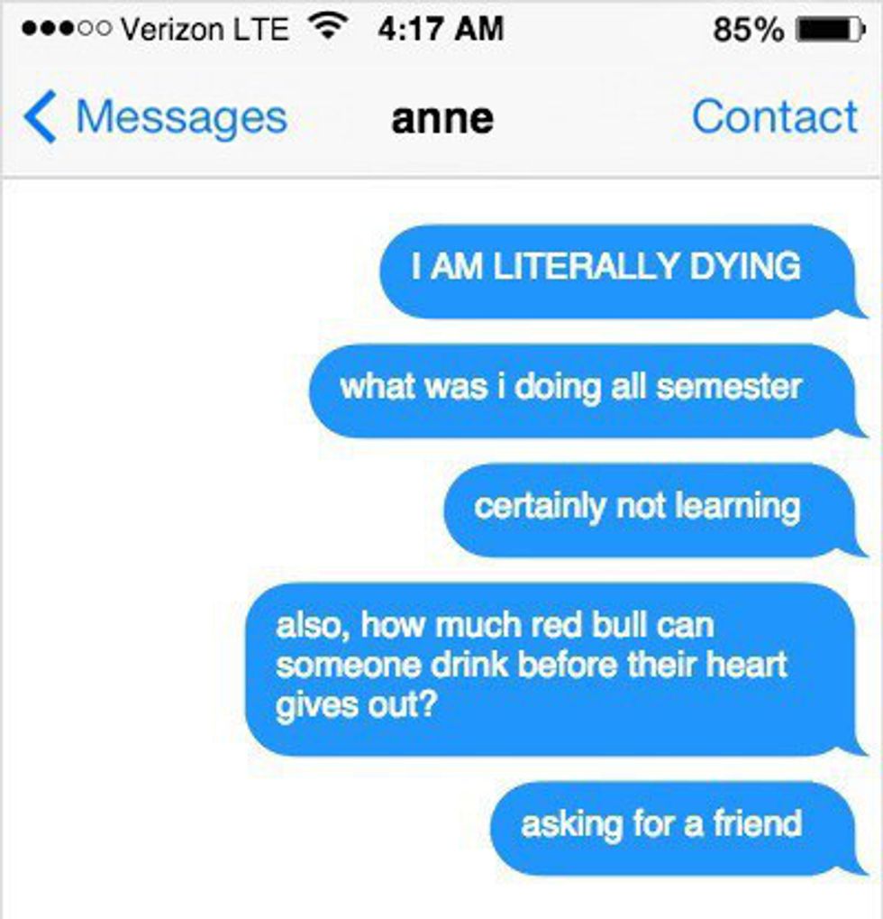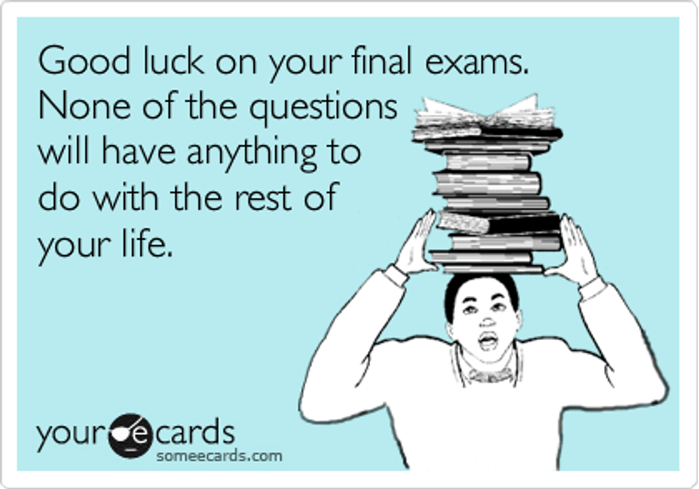 Finals suck and at points you may find yourself wanting to drop out of school. It wouldn't be abnormal for you to see one (or five) people crying in the library and students passed out on a park bench in the quad. It feels like your whole world is crashing down on you and all those "I'll do it next weeks" are coming back to bite you in the ass. But you can do this. The world will not end and life will go on. And if you don't believe me, here is a survival guide to attempt to get through finals: