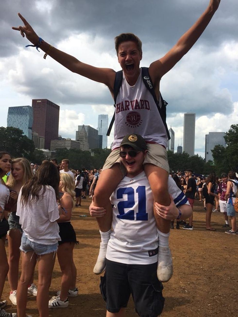 I hold up my friend Grant on my shoulders at Lollapalooza in Chicago, Illinois, Saturday August 5th, 2017