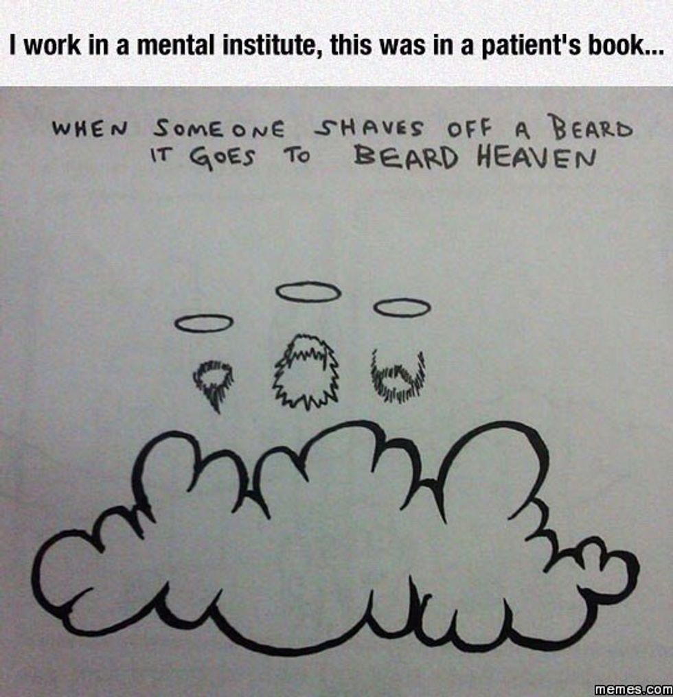 Shaving cream spatter rests in the sink. You drop your weapon, a disposable razor, onto the bathroom floor. You look back in the mirror and scream, "What have I become?" Your dog sprints upstairs. He is worried that his master might be in danger. But he doesn't recognize his master because his master had a luxuriant beard. That was you before you decided to shave your beard.