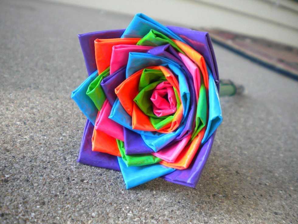 Using the steps above to make the petal (minus the rolling up), create multiple petals in whatever color you choose (I usually do a pattern with two colors or have 3 different colors that show one at a time in the flower). Then you place the petal on so its tip is even with the tip of the inner petal. That's it! continue doing that until you feel the flower is done (I usually use over 100 petals on a flower since I make them large)