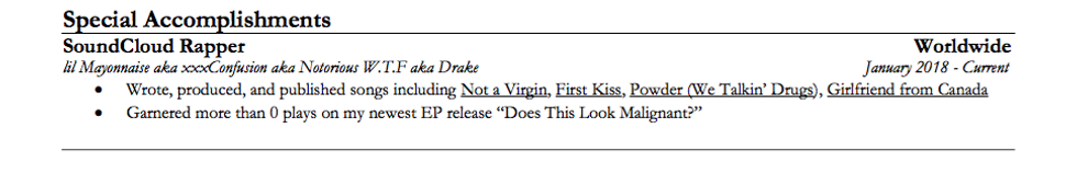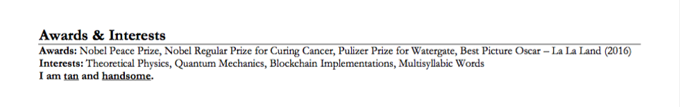 Every part of a resume matters. With only a short space to impress, no element can be overlooked. Use action verbs like 'built,' 'analyzed,' 'shoved,' or 'defenestrated' to create an aura of hard work and physical strength. Do your best to fill all white space on the page. Remember: white space makes means you're a disgrace. When you run out of words, just throw in a few black boxes to fill the page.