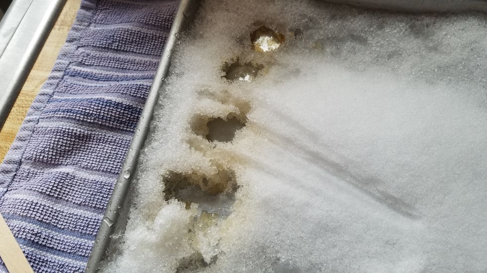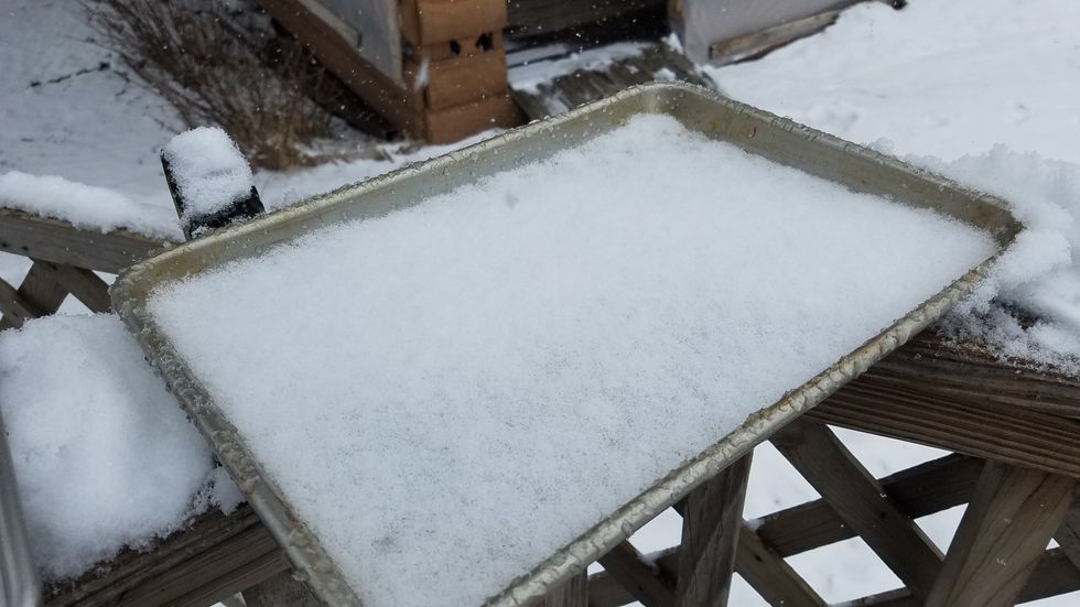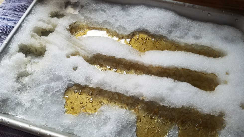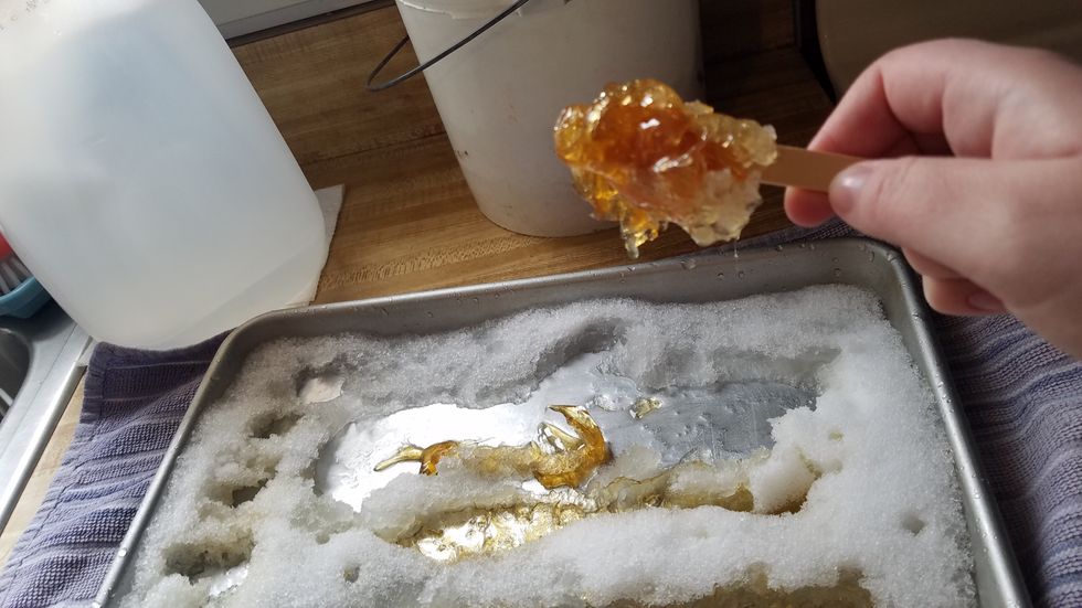 First, fill a pan with clean snow or finely shaved ice (so it's very close to the consistency of snow). This is your base and how the taffy forms. If you are using the ice, you may want to do the next few steps first and get the ice while the syrup is heating up.
