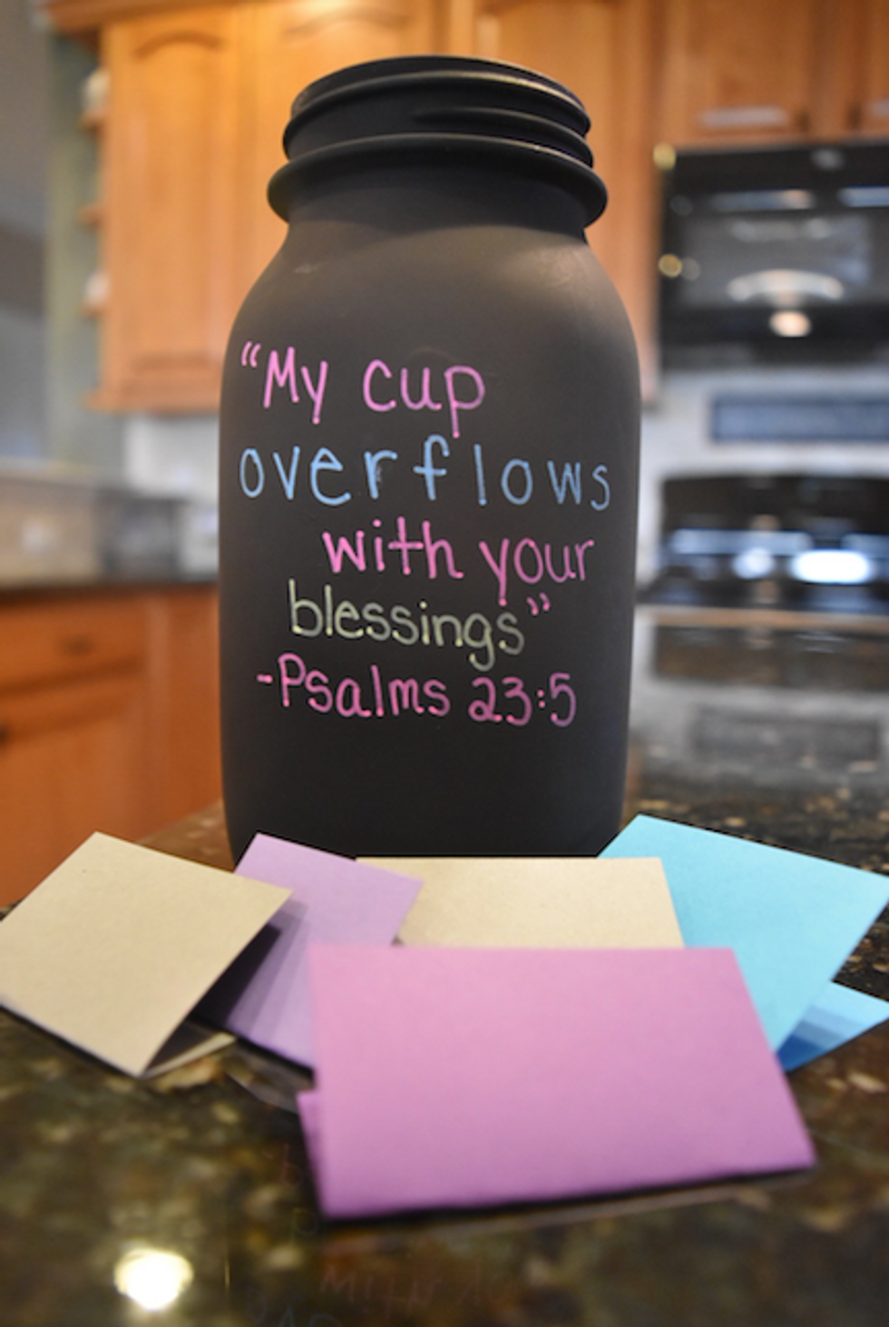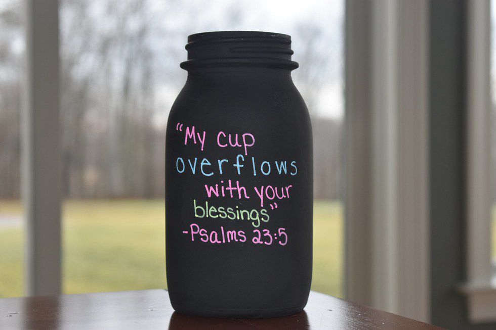 Decorating was easy for mine. I used chalk markers to write "2017 Blessings Jar" & "count your blessings" on the front. Then, I went on Pinterest and looked up different quotes and verses that people have used. I chose "My cup overflows with your blessings" -Psalms 23:5 because it was most fitting :)