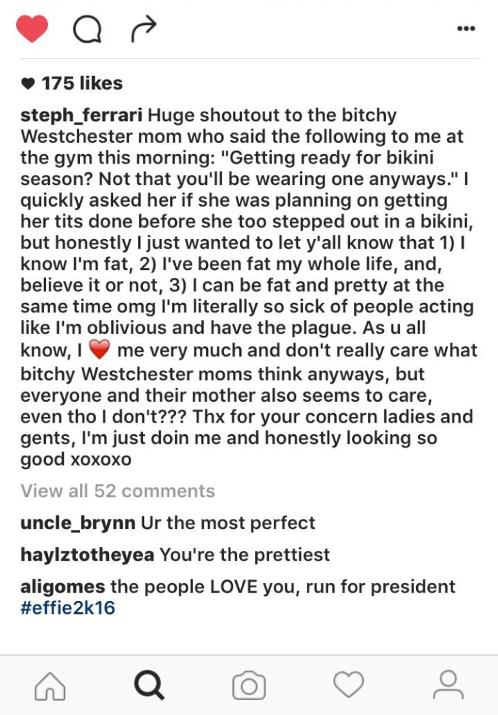 Thankfully Stephanie didn't let that woman get away with her rude and unnecessary comment. She really made a great point. You can be "fat" and pretty. You can also be "skinny" and pretty. Everyone has their own definition of these words. Personally, I dislike them because they carry such a stigma with them. I will just go with you can be pretty at ANY weight. Your outer AND your inner beauty. Not everything is about looks. Yes, of course we all want to feel beautiful on the outside. Want to know a secret? We all can! If we spread positivity and work out for ourselves and love ourselves regardless of the comments from anyone else, you're already there.