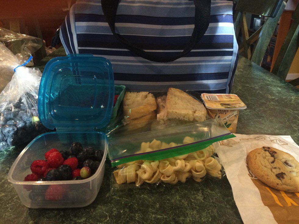 Here we have a turkey sandwich with mustard on sourdough bread, a banana yogurt, fresh-picked raspberries and blueberries, lentil chips and a chocolate chip cookie for dessert. One of my favorite things to do in the summer is going berry-picking on the weekends. Not only is it a meditative experience, but you can avoid the hassle of buying week-old fruit at the grocery store (at an outrageous cost), only to throw it away after three days due to mold. Picking your own not only supports local farms, but allows you to control the portion and the price tag. Trader Joe's "Crunchy Curls" taste just like potato chips, and 31 curls only contain 4.5g of total fat, and 380mg of sodium, but are packed with 4g of fiber and 3g of protein (not to mention they're fun to eat). The chocolate chip cookie is courtesy of McDonalds; I know, it's probably extremely unhealthy, but I crave them because they're always warm when you order them, and cost $1 for 3.