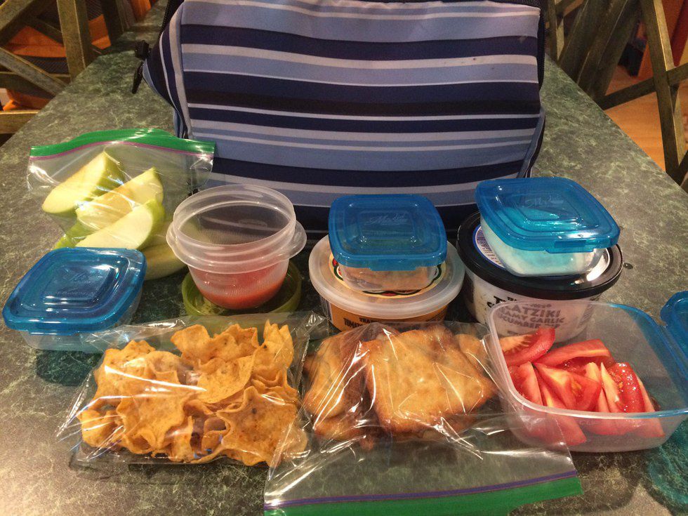 Pictured above: chips and salsa, semi-homemade pita bread with tomato basil hummus, chopped tomatoes and tzatziki sauce, and apple slices and Nutella for dessert. The key here is to sneak in a little spice – the chips are Tostito's Fajita Scoops, and the hummus is flavored to keep things interesting. I'm one of those people who cannot stand the bitter taste of store-bought pita pockets, and I'm too picky about which crackers taste the best with hummus. I recently discovered that it's pretty easy to make your own pita bread courtesy of Pillsbury Pizza Dough in a can. In the morning you will have enough time to follow the directions and bake the bread; just make sure you cut the dough into the right sized pieces and brush them with olive oil before popping them in the oven.