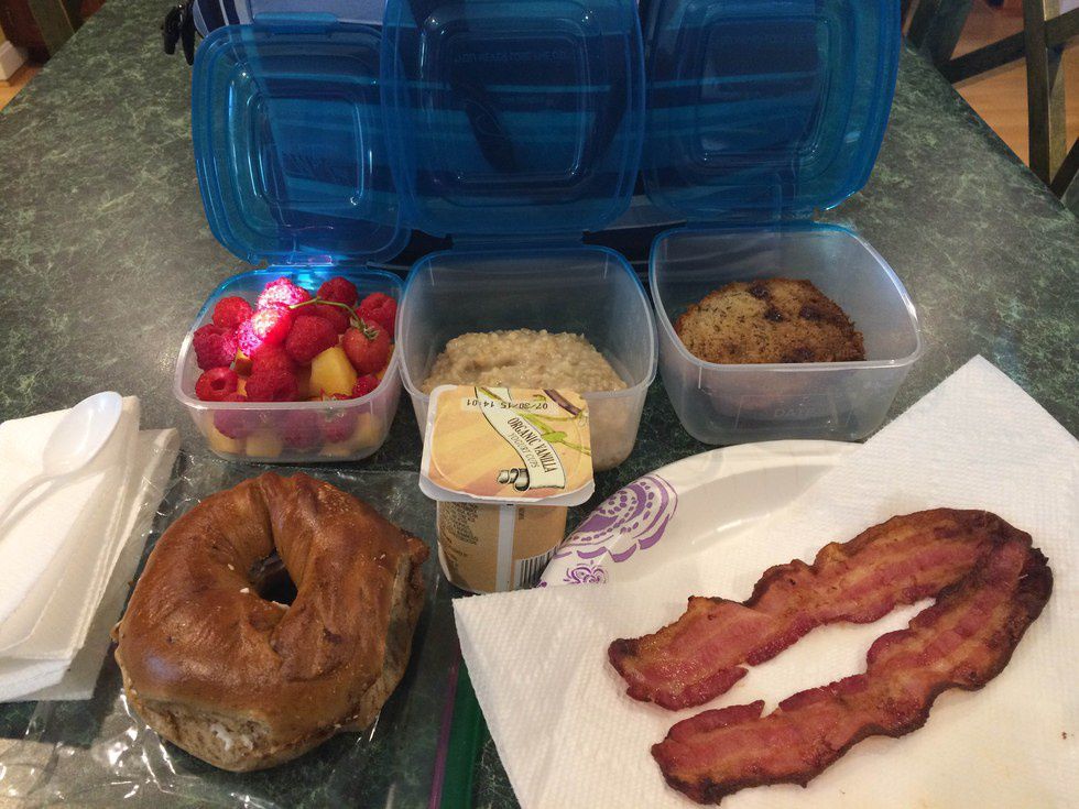 Breakfast is my favorite meal of the day, so why not eat it twice? Here I made a fresh cinnamon raisin bagel toasted with TJ's vegan cream cheese, TJ's microwavable oatmeal and banana yogurt, fresh-picked raspberries with diced nectarine, bacon (because why not?), and homemade chocolate chip banana bread. Bonus points if you can use the bacon to make a BLT, if you can snag a bagel from your local bagel shop, and if you're able to bake your own banana bread (I did that the night before using a FoodNetwork.com recipe, and it's delicious when you pair it with almond coconut milk).
