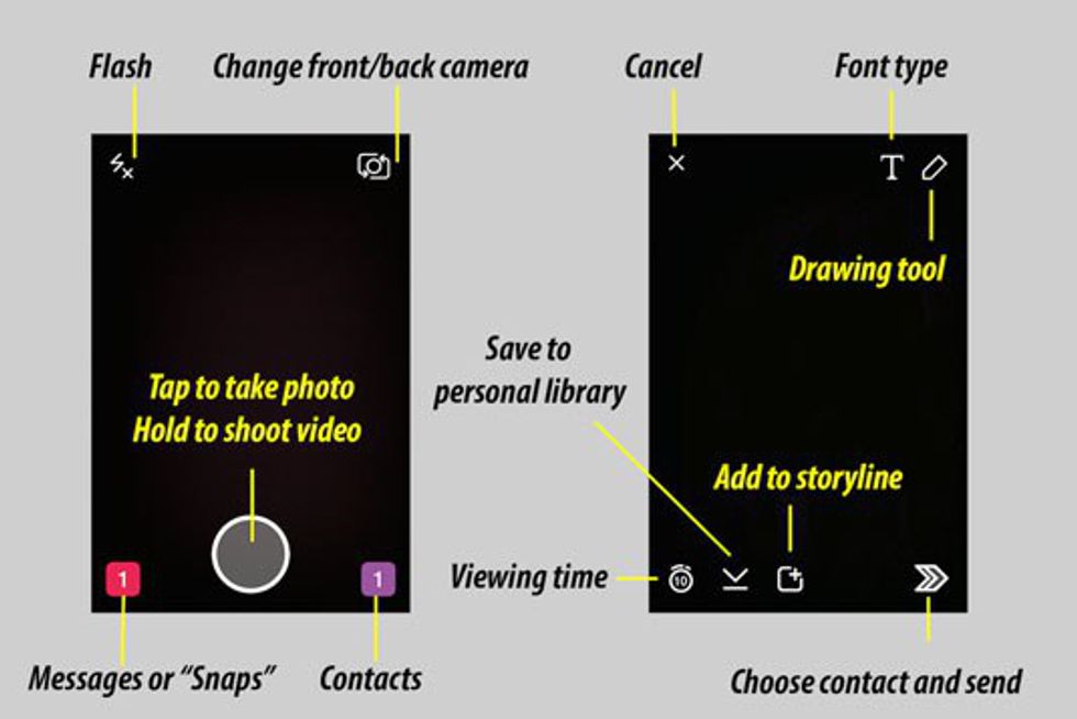 Snapchat is a social media platform where people are able to make ten second Vlog styled videos. To make a video, you just have to press on the large circle at the bottom center of the screen; press the button for however long you want your video to be. In order to take a picture, you will just tap the same button you will use to make videos. Images and videos can be taken using the rear or front-facing camera just by tapping the tool at the top right of the screen. Once an image is taken, you are then able to caption it by tapping the screen, or draw on it using the drawing tool. The bottom left icon is used for sending and receiving messages while the bottom right is used to view the stories of you followers.