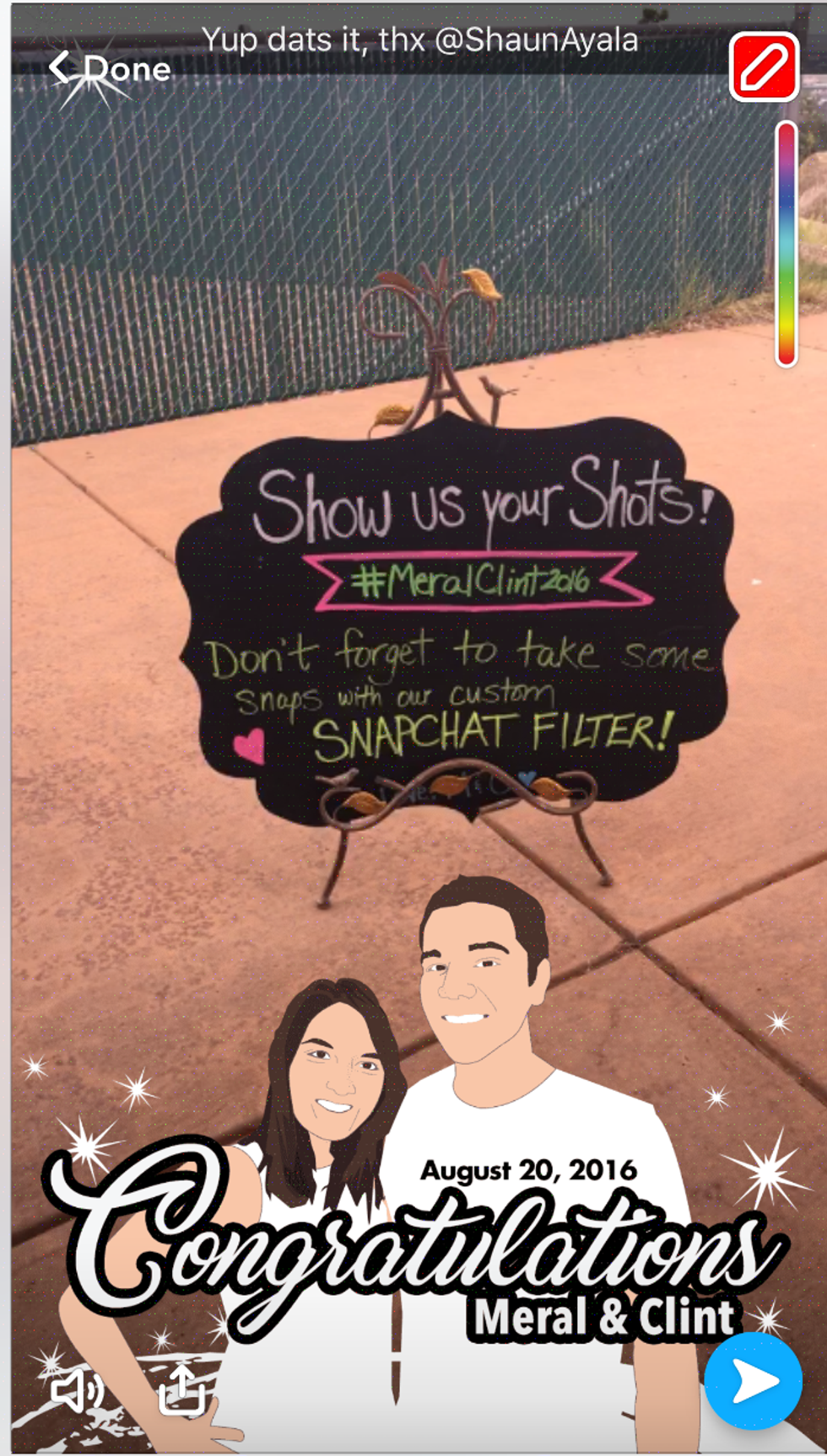 This is a relatively new trend. Trust me, your wedding guests will be delighted to find out there is a custom filter they can use on their snaps! I also surprised my sister and brother in law with this a few days before the wedding and they didn't know what the filter would look like until it was live! You can find the instructions on how to create and upload a custom Snapchat Geofilter here. It's really simple and very cheap! So don't be afraid to try it out. The hardest part is designing what the filter will look like and no worries if you're not talented with photoshop or canva, you can hire a graphic designer to design it for anywhere from $20 to $80 depending on the artwork. My filter was made by Award Winning Snapchat Interactive Storyteller, Shaun Ayala. Check out Shaun's website for awesome tutorials, tips, and his list of product offerings including custom geofilters for your next event! I was SO happy with how my snapchat filter turned out: