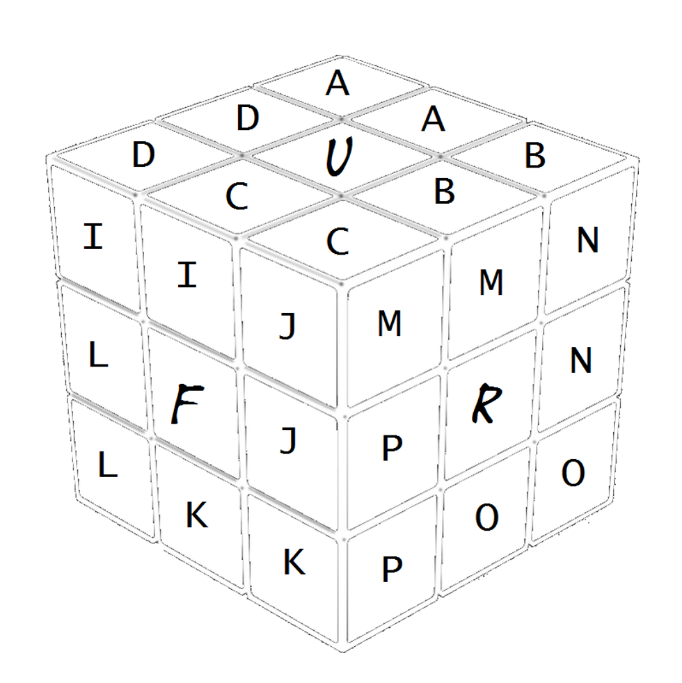 The bottom white sticker is "C," and the white sticker on the white-blue edge is "D." Voila, you've created your first letters! Keep going all the way around the cube in any order you feel comfortable, do the exact same technique with the corners (ignore center pieces) and eventually every sticker will have a different letter. Your cube should look something like the picture below: