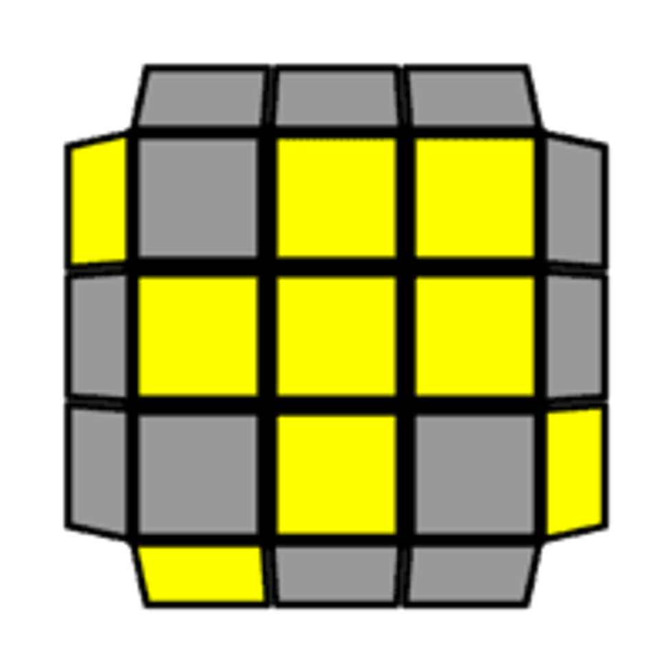 Finally, the “O” and “P” are all that are left in solving your Rubik’s Cube. The “O” stands for “OLL” (Orientation of the Last Layer), and the “P” for “PLL” (Permutation of the Last Layer). Here, you’re going to have to rely on algorithms to complete the cube; there are 57 for OLL and 21 for PLL. In the scheme of things, these are not very many at all. There are a plethora of websites (cyotheking and Badmephisto being two favorites among speedcubers) available with every algorithm posted and how to memorize them. To solve OLL, start by looking at the picture above. Once your cross and F2L are solved, you will have one of the 57 possible patterns on the top layer of the cube. Focus only on the color that is on top; if you have a standard cube and started with the color white, your OLL color will likely be yellow, so only look for the yellow pieces in solving OLL. Once you recognize and perform the algorithm that solves OLL, your cube will look like the picture below: