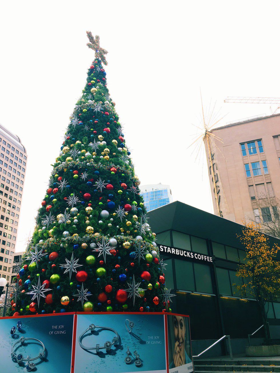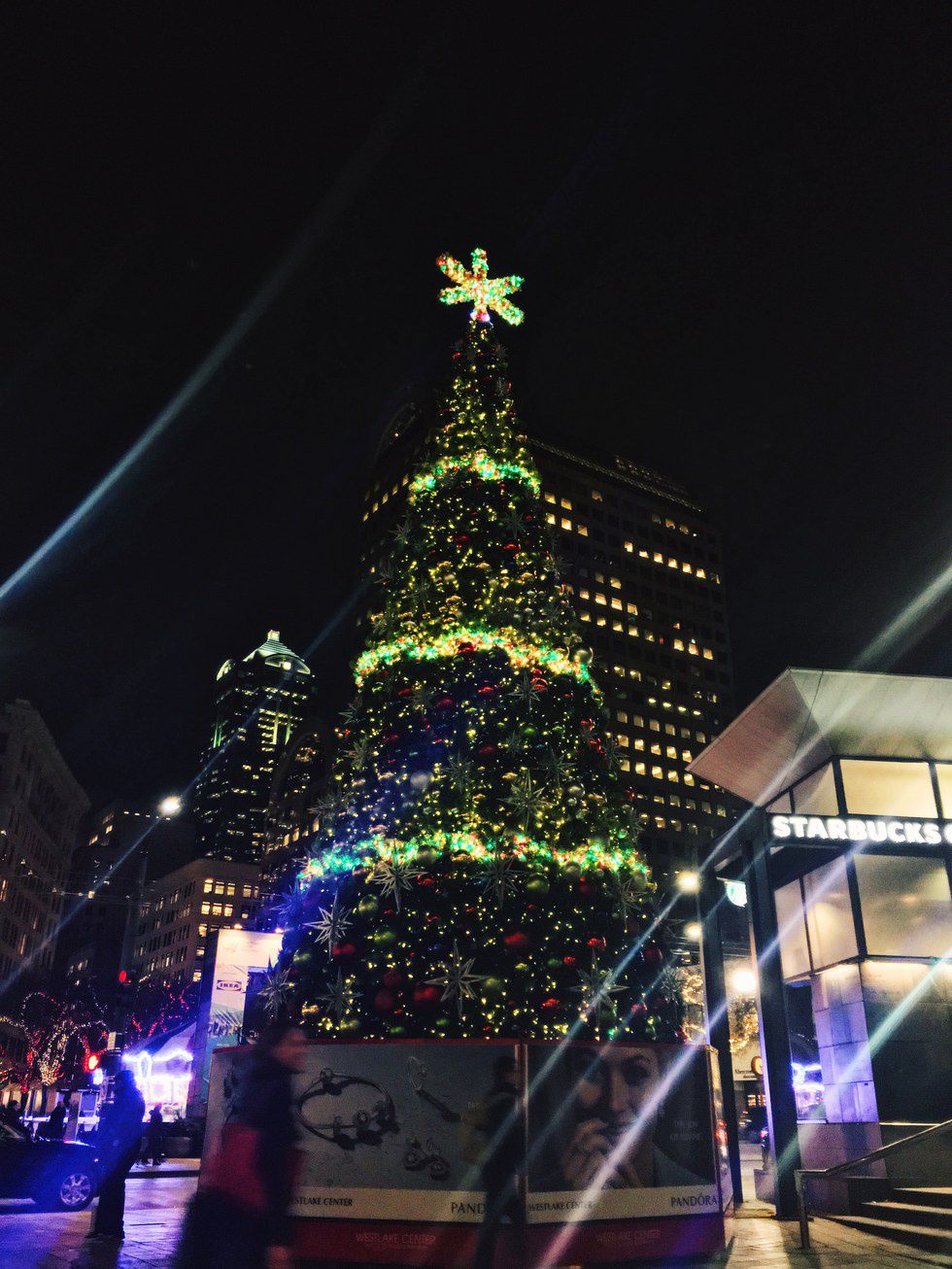 Now, if you just happen to pass by Westlake Center on your way to Pike Place, you'll notice a huge green thing outside of the entrance. That would be a Christmas tree. As you pass by, you'll feel obligated to take a picture either of it or in front of it because you're slowly being enchanted by that holiday spirit.