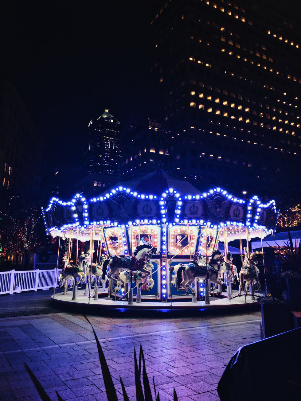 Now that you've consumed 2x your body weight in cheesecake, time to walk it off and see downtown Seattle light up as night falls. There's just something about sidewalks lined with twinkling light trees that makes you feel in the holiday spirit. Oh, and remember that huge Christmas tree I mentioned earlier? Right across the street is a Holiday Carousel. It doesn't get more holiday than that!