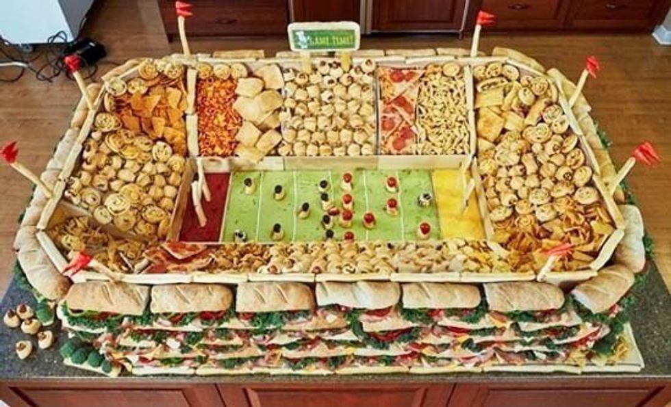 Food is just as important as the game. Superbowl Sunday is about the wings, the drinks, the pizza, or whatever is being served. Need to avoid smack talk? Eat. Don't know what is going on the screen? Food table! If you really don't know what to say, just stuff your face.