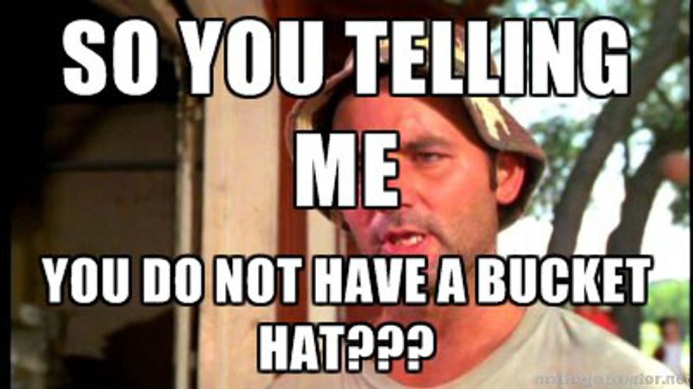 If you want to get real crazy, whip out the bucket hat. It will keep the sun out of your eyes, and you will just look cool. The bucket hat is coming back in full swing. Make it even cooler if you find a Purdue one.