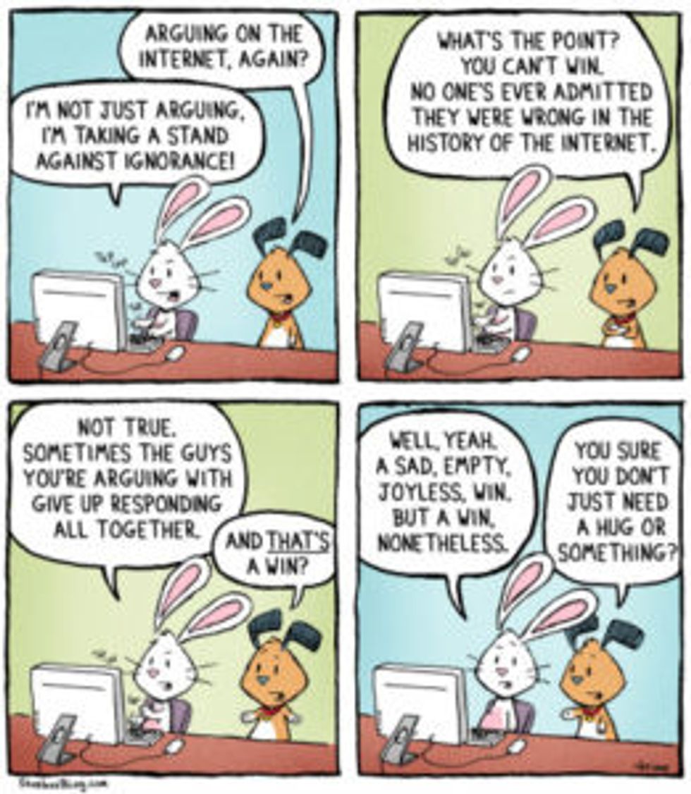 So, I can't promise I'll never defend my argument again because that's not a promise I can keep, but when the typical person who comes loaded with Alex Jones references in their unsubstantiated argument, I'm fully ready to just ignore them and not engage. They aren't there to actually hear me anyway.