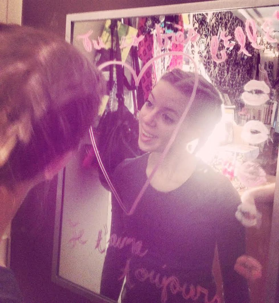 2. Wake up. Take your most expensive (Dollar General) lipstick and draw a heart on your mirror. Surround it with compliments (preferably in French) and kiss marks. Stand there for at least thirty-seven minutes and six seconds admiring yourself. Strategically stand in front of the lamp so you can genuinely tell yourself "Darling, you are absolutely glowing!"