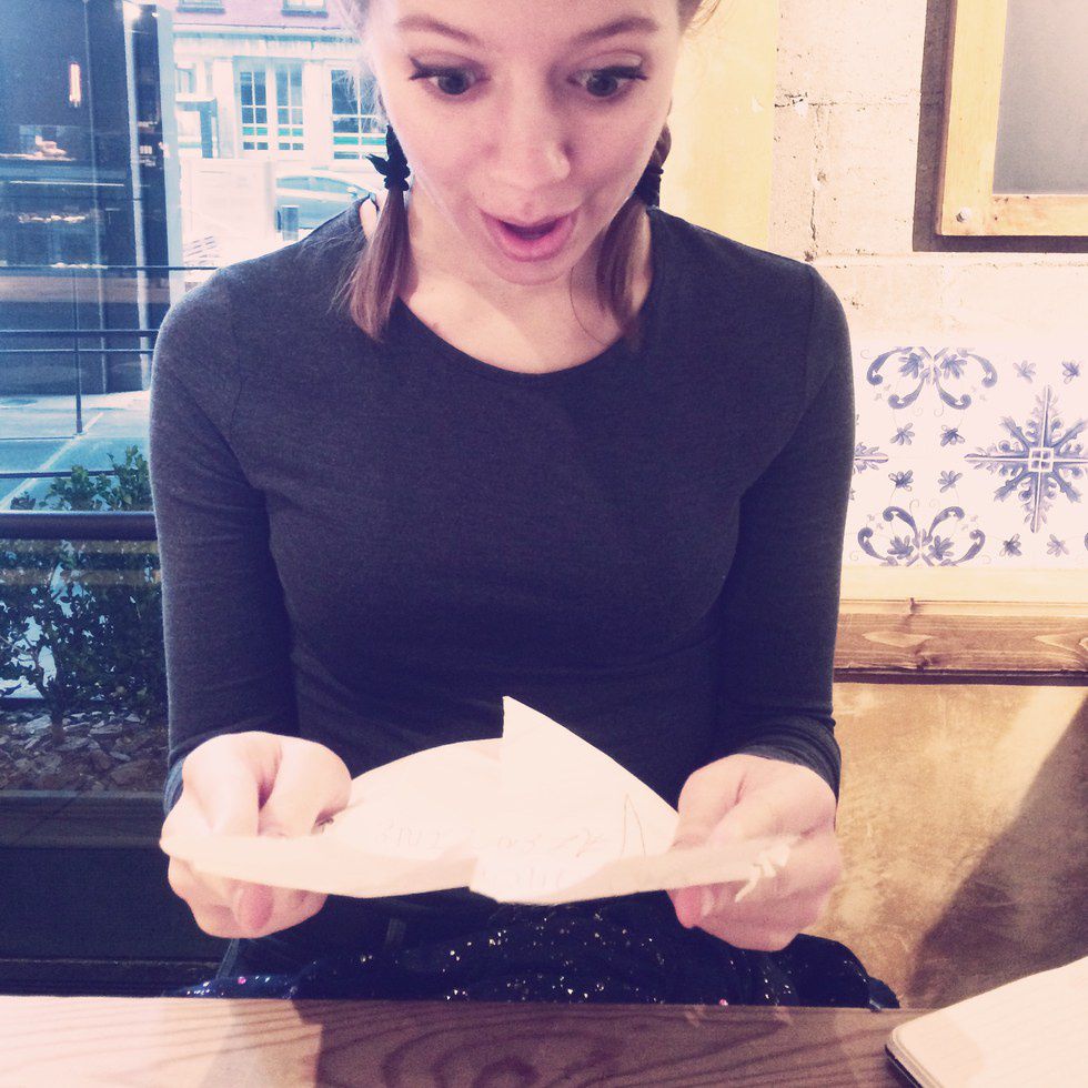 6. Go to a restaurant (doesn't have to be fancy). Write yourself a love note. Place it under your plate. When the server takes the plate, be very surprised at the slyness of your "secret admirer" and blush while reciting the beautiful note - out loud - for all other restaurant-goers to hear.
