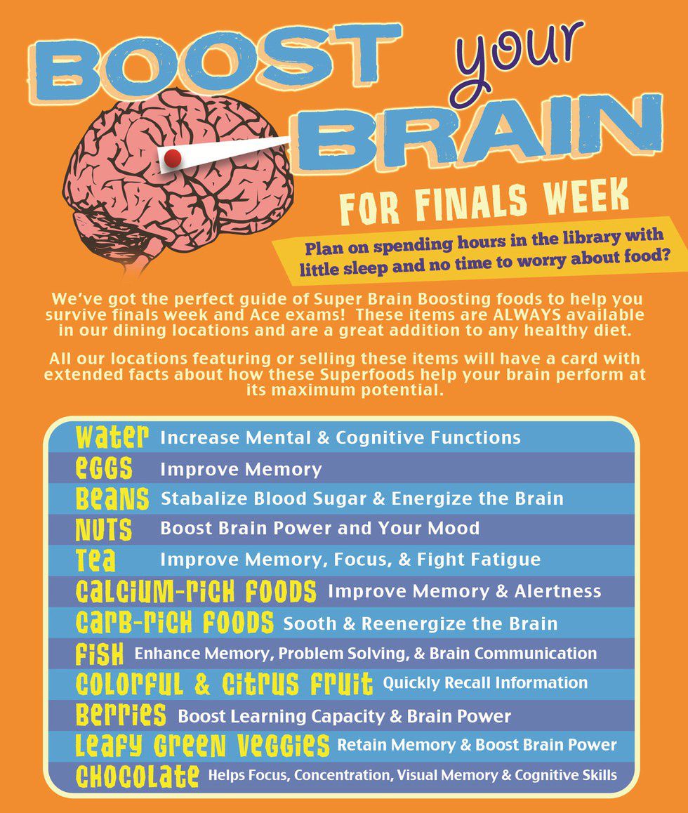 It's super easy to stress eat during finals week, but always remember that your health comes first! Nourish your body by ditching the junk food and make sure to stay hydrated by drinking lots of water. Substitute chips and ice cream for foods with high antioxidant levels, like berries, dark chocolate and nuts to help you focus longer.