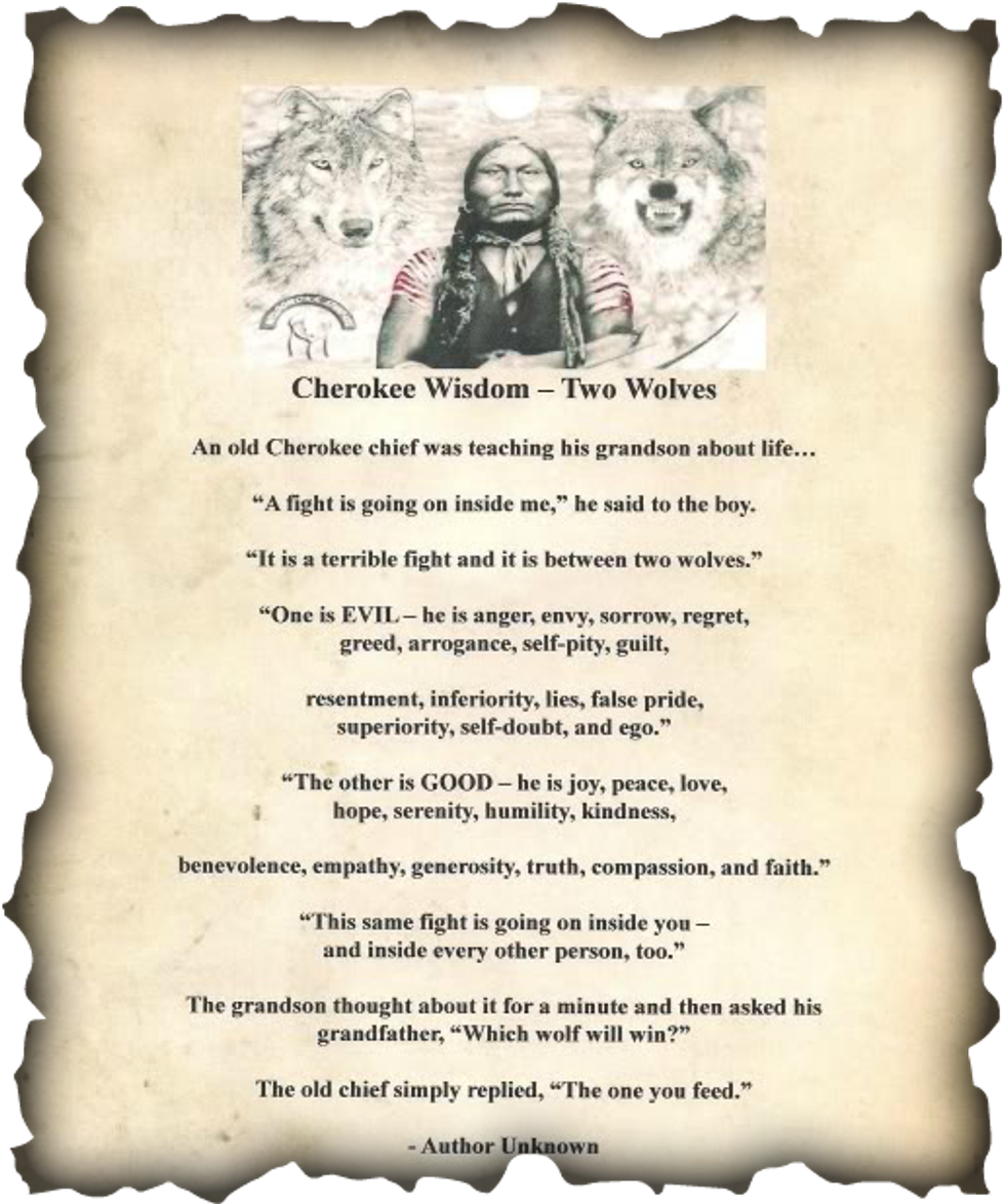 Many life lessons can be learned from various cultures around the world. From legends told by the campfire to tales told at the dinner table, something can be taken away from most of them. Below is a story about two wolves told by a Cherokee elder.