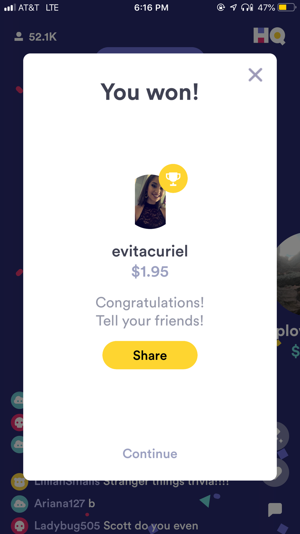 I got question 9 wrong, but I had an extra life so I used to it. People can comment on the answer while those 10 seconds are ticking so that's what I was relying on. I was purely guessing what the right answer was and I was making good guesses. I was freaking out because I was on question 12 and I was going to win. Next thing I know, I freaking won HQ trivia. The prize was $5,000, so the money was divided between the winners. I won $1.95, but the thought that I won HQ mattered even more.