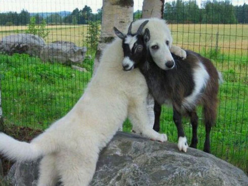 Even this dog and goat can hug each other!