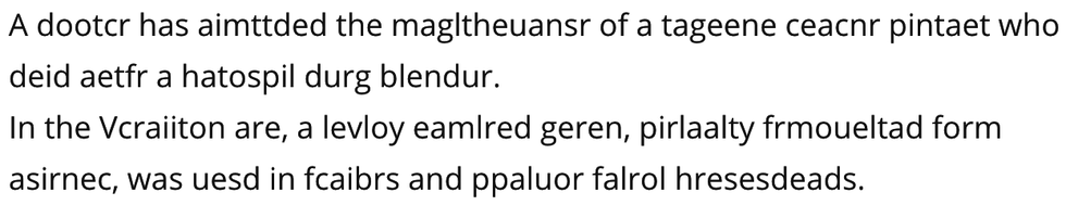 Can you read this article with perfect fluidity, or maybe not perfect, but with little to no trouble at all? Well, that's your uoncsncuios mind at work. A Cambridge study found that this is baecsue the brain does not read every letter individually but isntaed reads the word as a whole, and we are able to read the sentence whtiuot much trouble as long as the first and last letters are in the correct place.