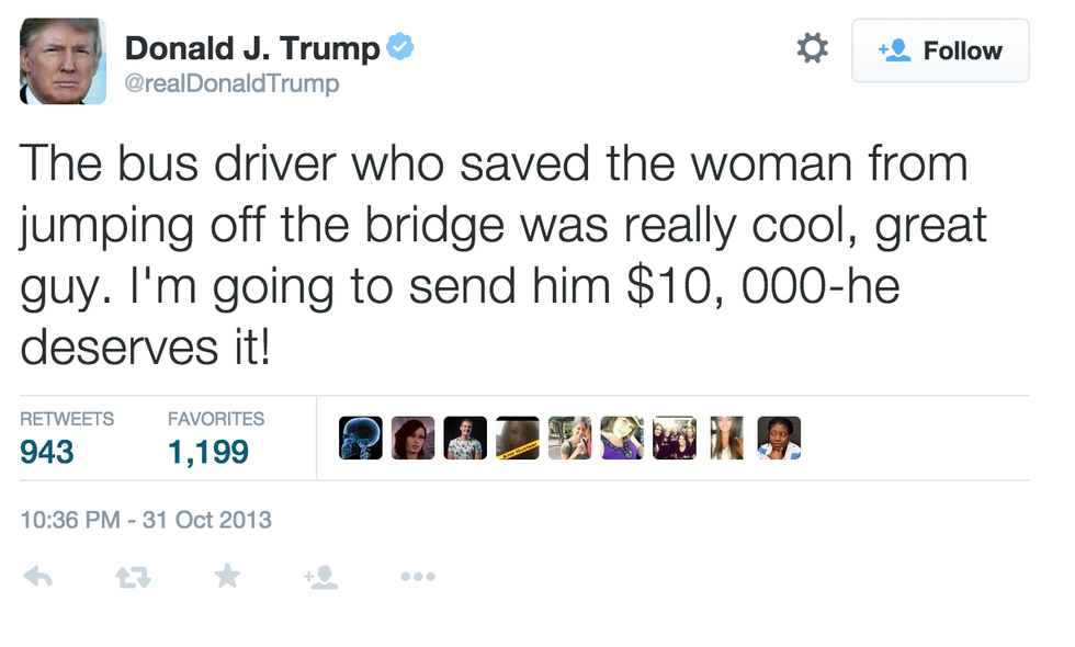 In 2013, Donald Trump tweeted about a Darnell Barton, a 37 year old bus driver who saved a women from jumping off the Scajaquada Expressway in western New York.