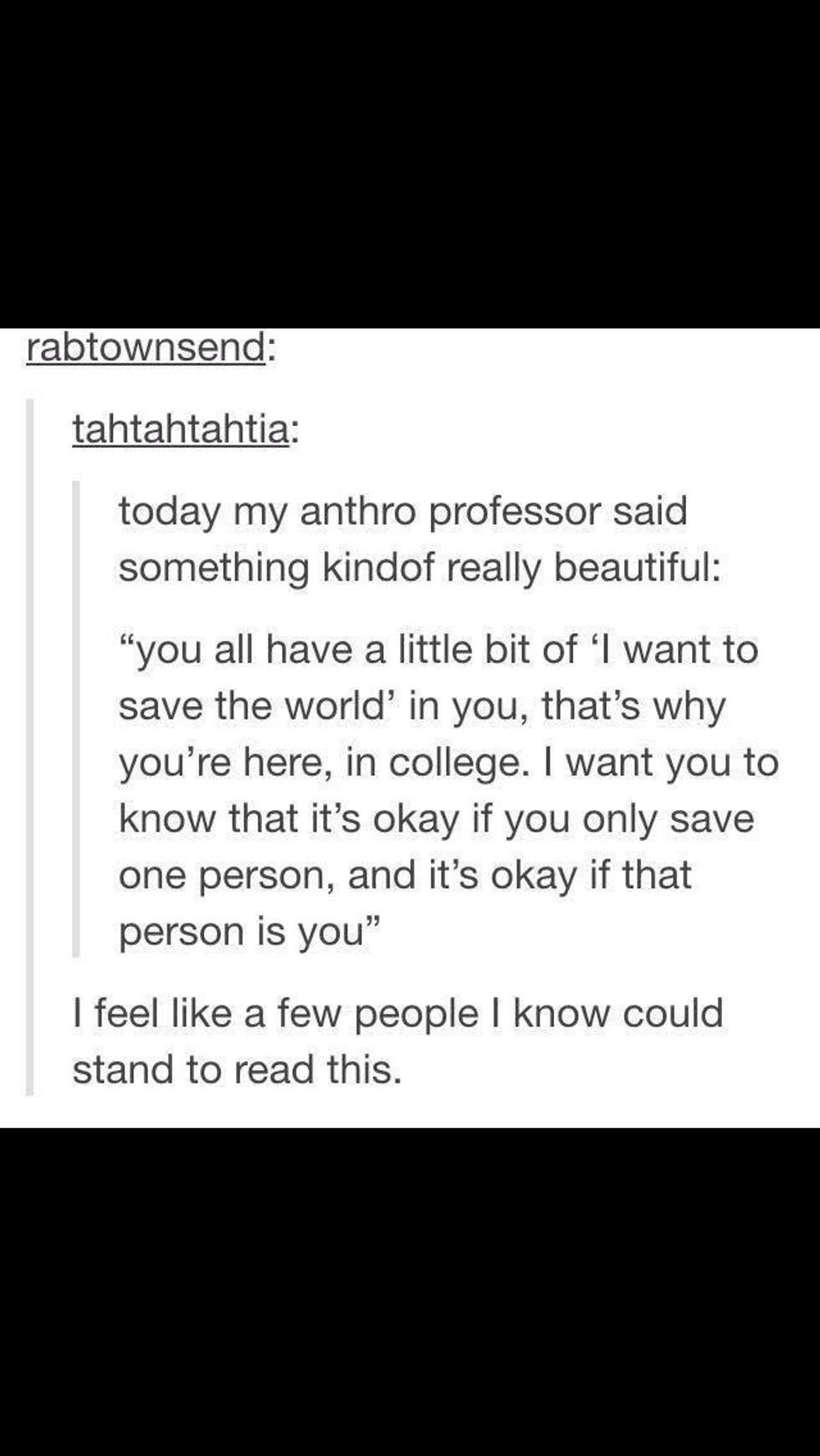 That's not to say there aren't people worth saving. There are plenty of people who take your ultimatum of "fix it or call me when my inheritance kicks in" seriously and shape up and turn their lives around and make better decisions. Some people just don't care. They only care when one foot is out the door and your suitcases are packed and your car's warmed up. They only care once the door is slammed in your face and you drive away with the intent of never returning. You don't have to save those people. I read a quote on Pinterest from a Tumblr girl's anthropology professor: "You all have a little bit of 'I want to save the world' in you, that's why you're here, in college. I want you to know that it's okay if you only save one person, and it's okay if that person is you." Always remember that.