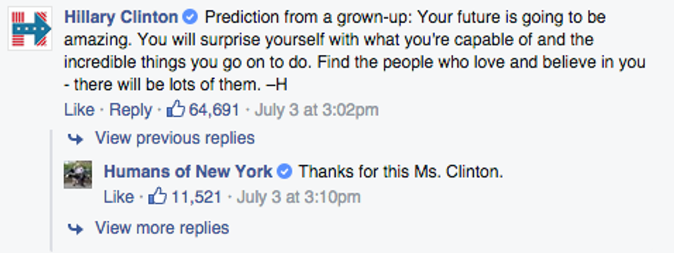 While scrolling through HONY I not only notice the thousands and thousands of likes on each picture but also the uplifting comments that people around the world post. It’s great to see how one picture can bring so many wonderful comments about life, and how supportive total strangers are to one another. One of the most popular comments on HONY lately was when Hilary Clinton commented on a post about a young boy who is dealing with the fact that he is gay.