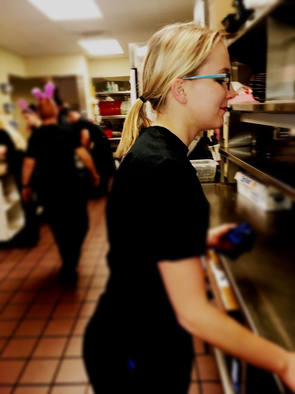 “This one lady always comes in with her husband and loves shiny pennies, so I always make sure that I give her shiny pennies for her change. I love those regulars. That’s one of my favorite parts about working here. I know what the worst thing is. I hate when I am hostessing and I say, ‘Hello, how are you doing today?’, and then someone just says ‘two’ or ‘three’ or something and don’t even answer.