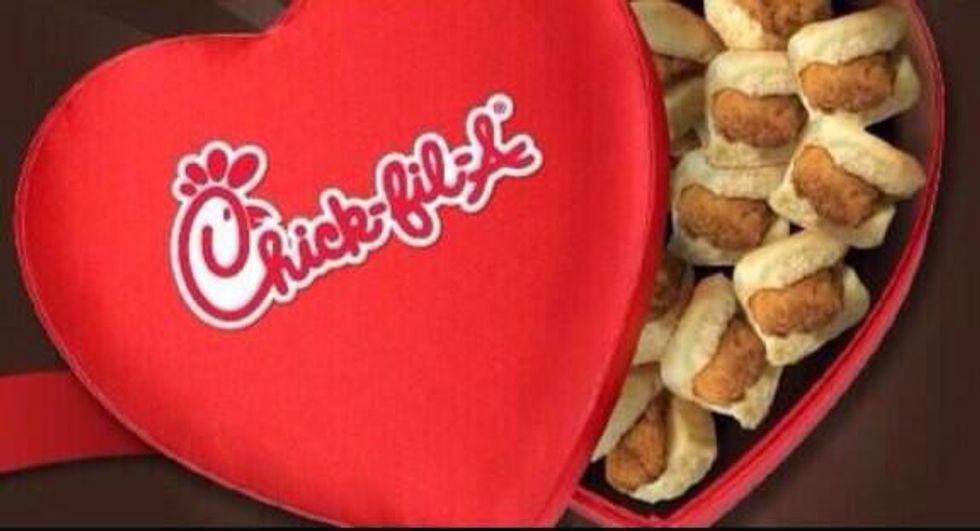 Looking for breakfast? At Chick Fil A you can get chick-n-minis in a heart shaped box.