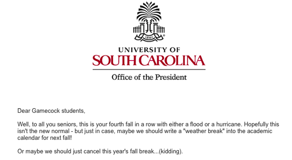 Flooding in Columbia, SC, is a serious issue and more precautions should be put in place to protect students attending USC. Campus closure should be considered at an appropriate time to allow students to travel safely home.