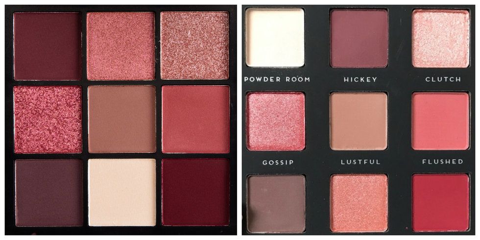 On the left is Huda Beauty's 'Mauve' eyeshadow palette that cost $27 on Sephora's website. To the right is the 'After Hours' eyeshadow palette by Bad Habits found on Hush Cosmetics costing $12. Both are beautiful and pigmented but the price difference is what catches a gurus eye. This dupe is a 55% save!