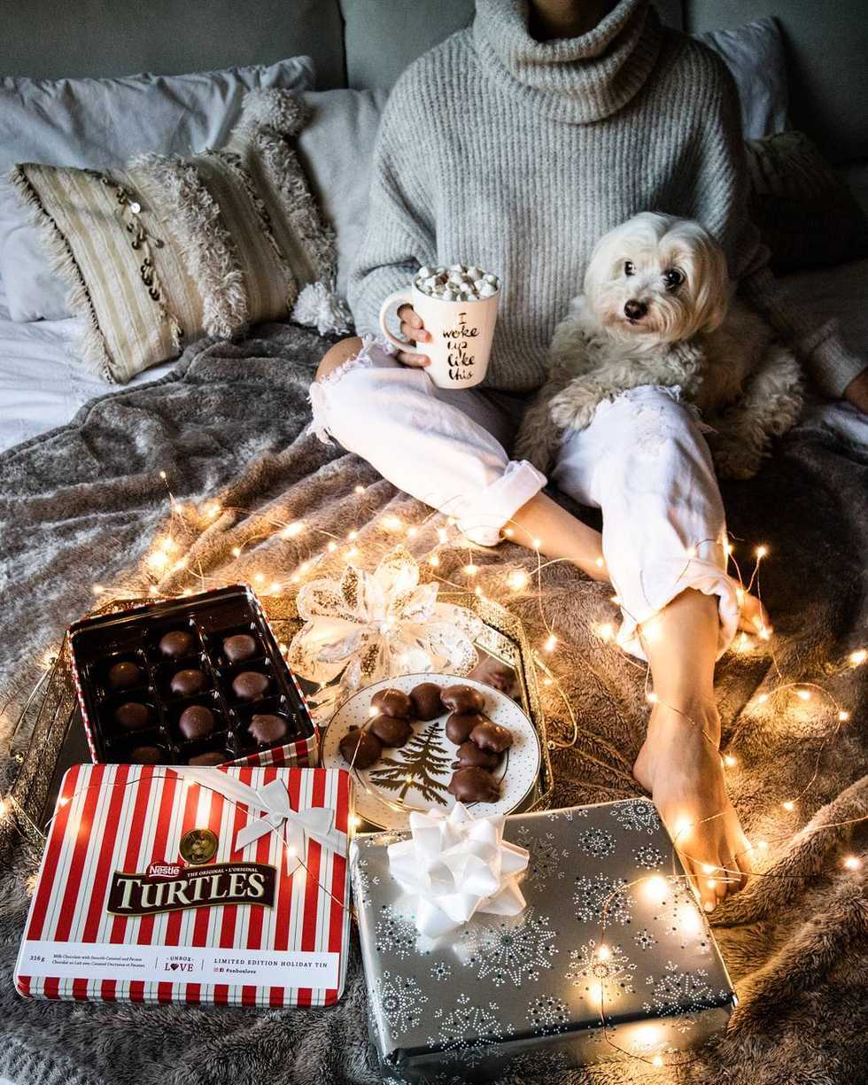 Wear thick cozy socks, oversized knitted jumpers and cardigans, pajamas and fluffy slippers.