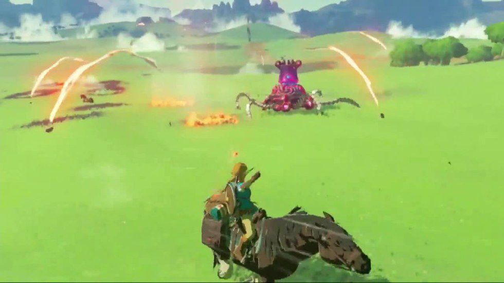 Do you see this vista? This is the first thing you see in the game once you get out of the starting cave(after waking from suspended animation and receiving your free iPadSheikah Slate. Off to an interesting start here). Besides being really f'ing gorgeous, you can reach practically every point you can see. EVERY point. Link can climb those mountains. He can glide to the volcano. And yes, you do need to get to the castle to kill Ganon; that's just the way Zelda games are. And nothing's really stopping you from walking in a straight line to that castle from the start. No really long openings(looking at you, Skyward Sword), no "Collect the 3 pendants" or "Rescue the 8 maidens" tripe, and( kinda sadly) no wolf action sections before being allowed to explore the area. Well, except for this: