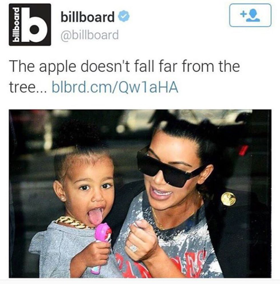 Now, the statement clearly has to do with Kim Kardashian's infamous sex tape, but it's unnecessary to bring North West into the mix. That's part of the reason why hundreds of Twitter users tweeted Billboard over the tasteless remark, prompting Billboard to take down the post within minutes. North West has been frequently sexualized long before this. For instance, last winter when she attended a fashion show in sheer clothing. Before that, she has been highly fetishized for her light skin and curly hair among many men and women who consider her features to be desirable. The worst thing about this -- besides the inherent sexism and misogyny -- is that North West is a young child that probably doesn't have a clue as to any of this -- let alone the meanings behind them.