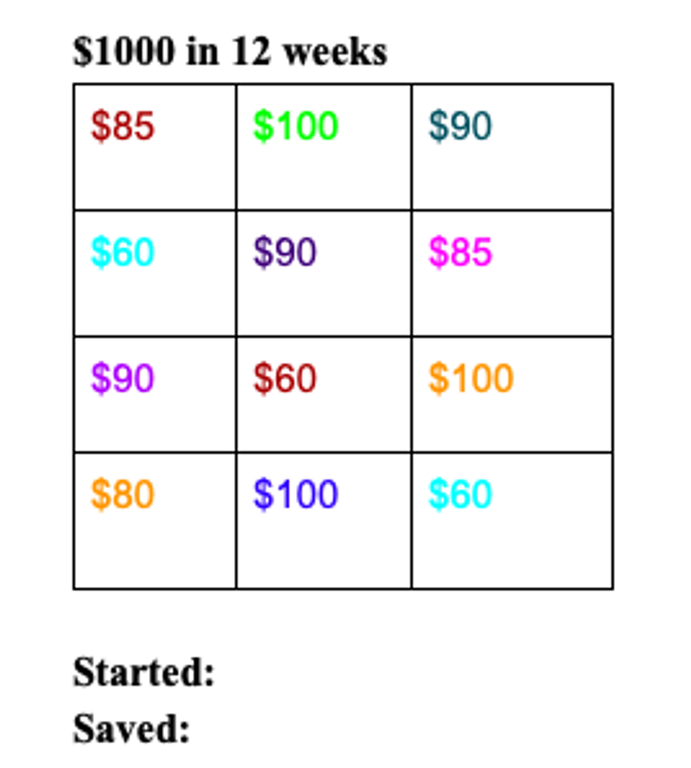 Every week you can choose any amount in the 12 boxes and cross it off once you save the money.