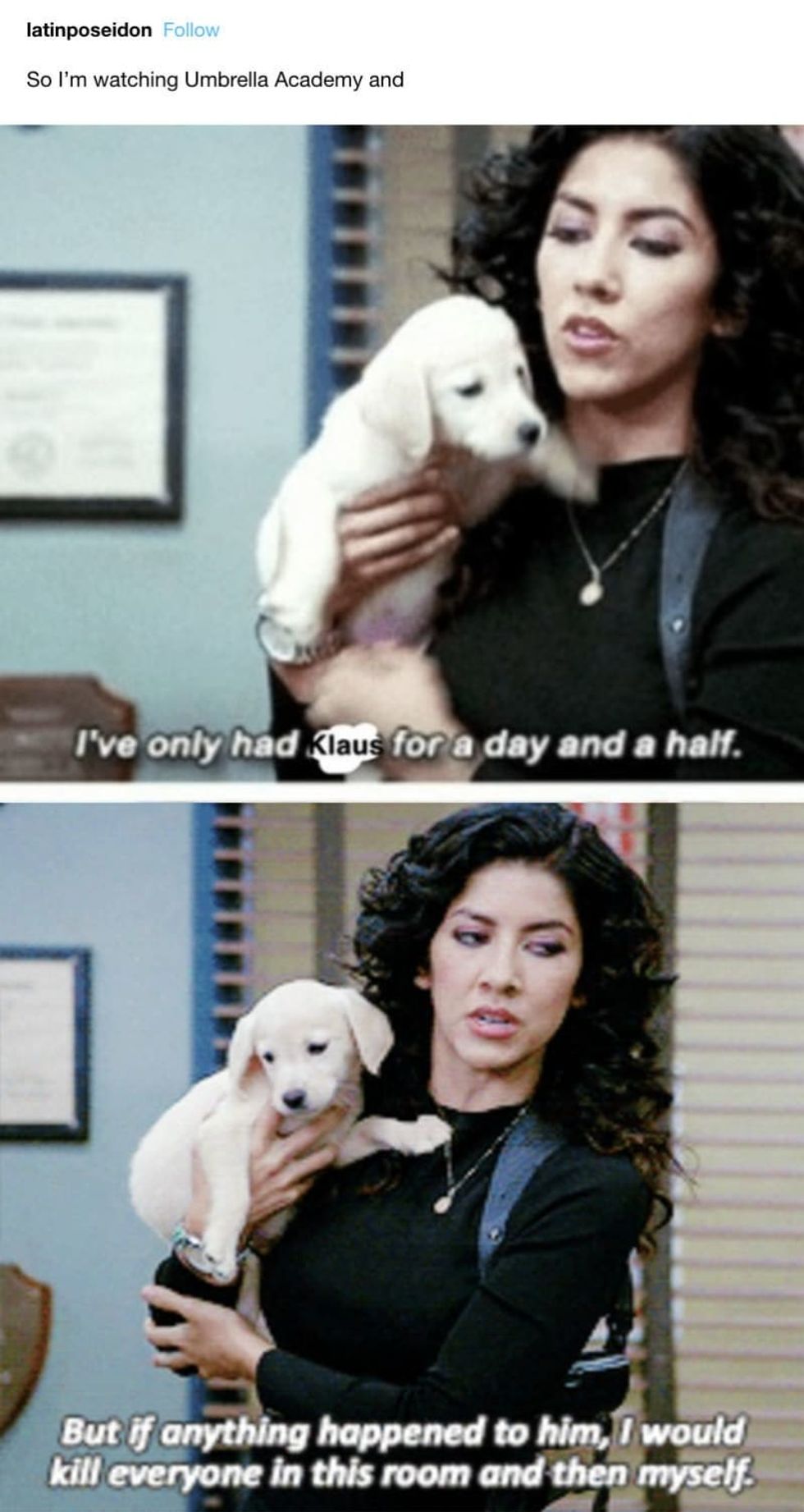 Klaus when Cha-Cha and Hazel broke into the house #UmbrellaAcademy https://t.co/qXk4E1ydMR— ♍🌙 (@♍🌙) 1550379764.0