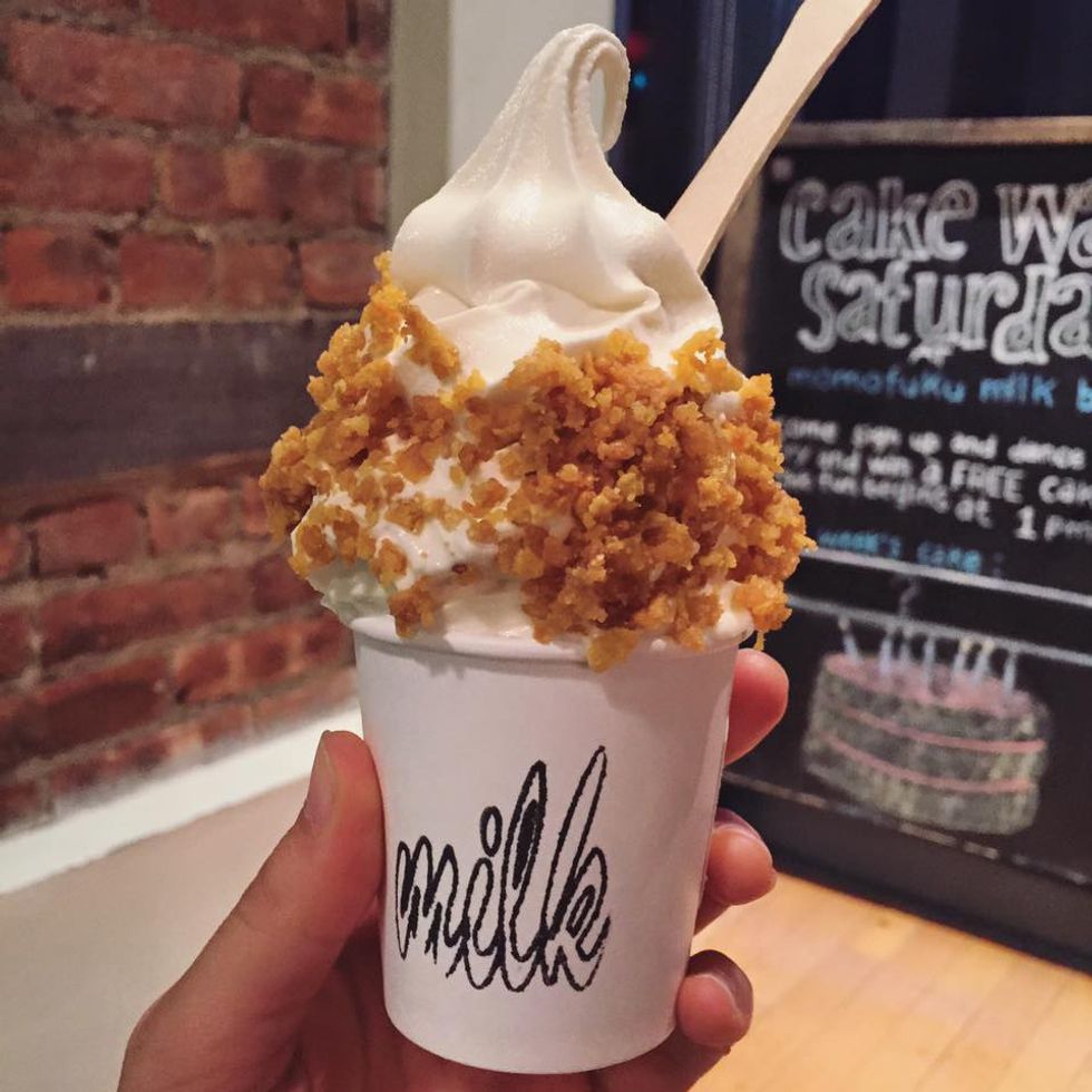 This sweet treat tastes exactly like cereal and milk. The soft serve ice cream mimics the milk that you drink from the bowl after you have eaten all the cereal. A crunchy cereal is then put around the rim of the cup to be the cereal in the bowl.