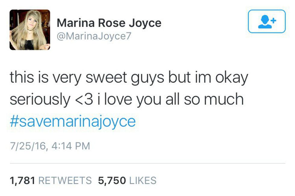 On Joyce's Instagram, she's allegedly posted older pictures of herself and "hasn't exactly been herself" according to her fans on Twitter. Some have even claimed that her social media and possibly her YouTube channel is being run by someone who isn't her. This led to "#savemarinajoyce" trending on Twitter. After a day of people panicking over her wellbeing, Marina Joyce finally sent her first tweet addressing the situation: