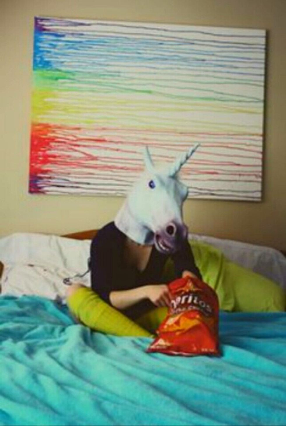 I threw glitter in the air and trotted my way into the living room. I stared at them for precisely a minute then I got my Unicorn mask I bought at a local Halloween store. I slowly put the mask on while staring into their eyes. They say it was awkward I say it was us bonding. It was pretty deep. I bowed down and saw no expression on their faces.