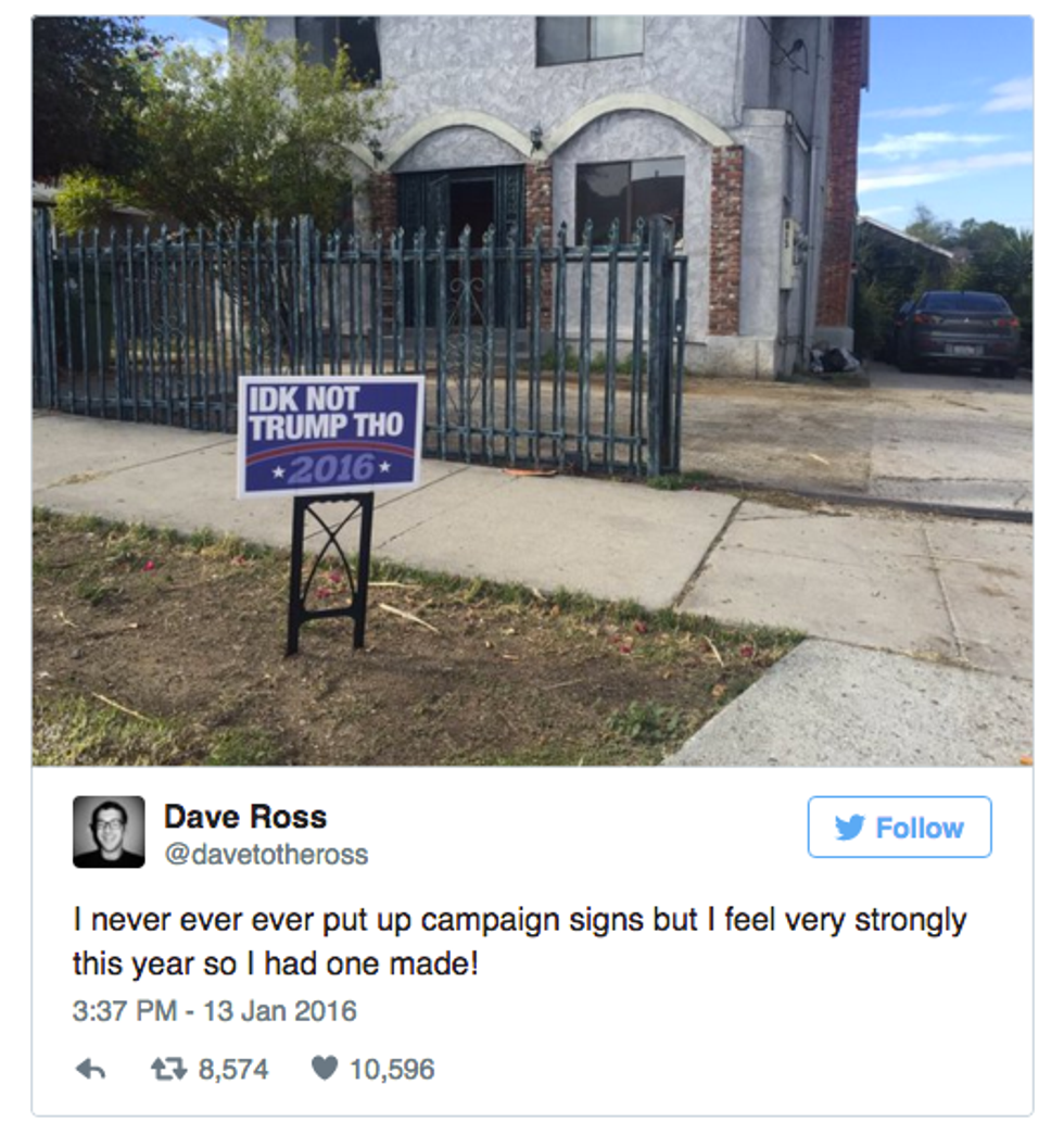 It all began with stand-up comedian Dave Ross. Ross originally tweeted a picture of a campaign yard sign with the words "IDK NOT TRUMP THO 2016" in patriotic lettering and style. The caption underneath the picture read, "I never ever ever put up campaign signs but I feel very strongly this year so I had one made!" (see below).