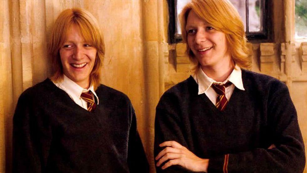 I'm Fred, and he's George. I'm George, and he's Fred. We're twins. We come as a package deal because odds are we like each other better than we'll like you anyway. Biggest hobbies include making jokes and playing tricks. Yeah, same with me. And I'm in ol' Gryffindor, just running that and everything. I'm in Gryffindor too, but I'm actually the one everyone likes. We both enjoy our family and getting into trouble. So if there's a lucky girl out there looking for double the trouble, we're your twins. #SolemnlySwearWe'reUpToNoGood