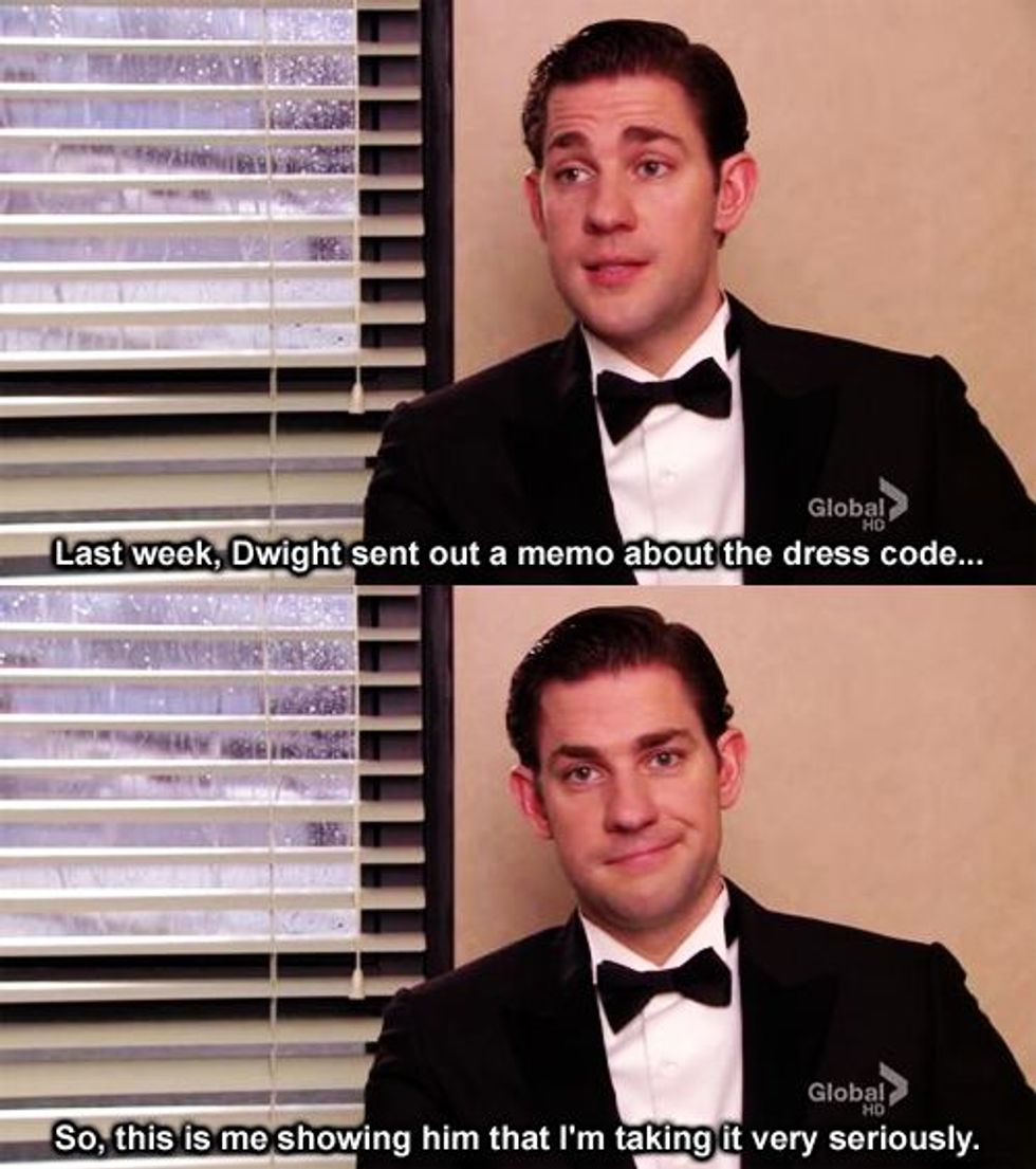 Jim would take his classic Instagram picture with the "Gone to Texas” sign. Jim’s motto, just like many students at The University of Texas is “Work hard, play hard.” … And the students, just like Jim, deserve to have the fun afterwards. Jim knows how to get his work done and have a good time afterwards, or even have fun while he is getting his stuff done. No matter where Jim is he manages to have a good time. It’s also clear to see that in little ways that Jim and Dwight have rivalry going on between each other, even if neither of them admit it.