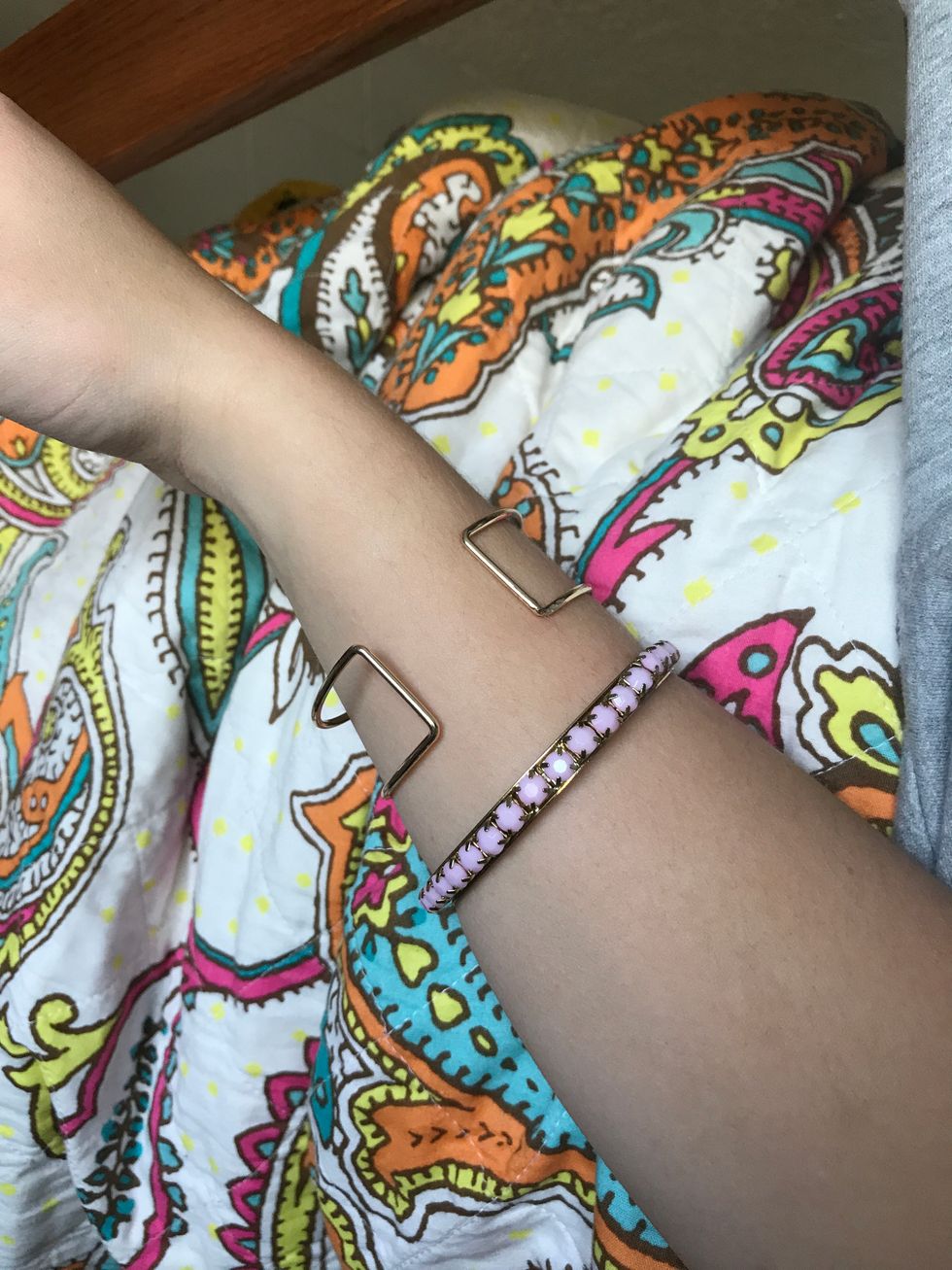 Accessories!! The pink bracelet that I'm wearing in the pic above (and below) was $2, and the gold cuff was $1.