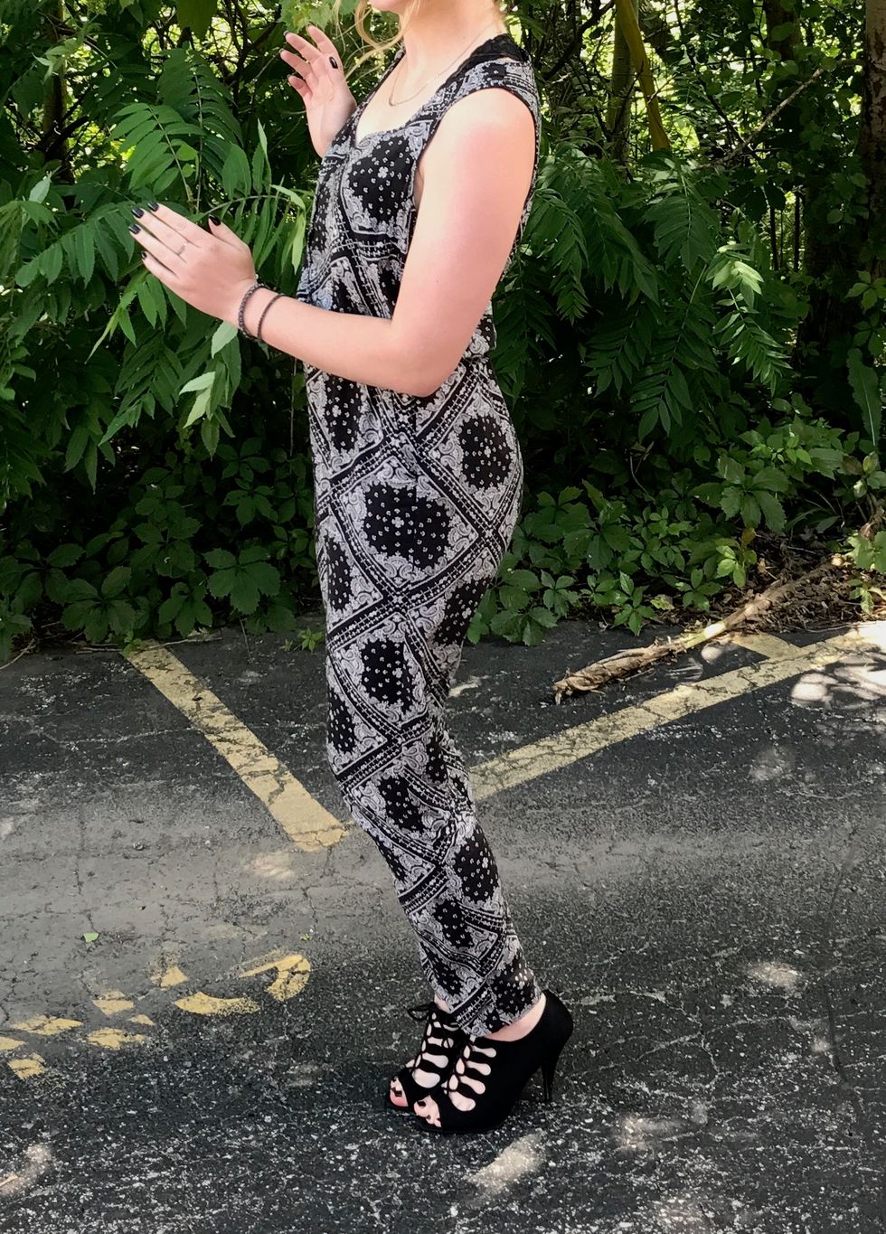 This black and white patterned jumpsuit is from Forever 21, but I picked it up at Goodwill for $7. There were no rips in this bad boy and it works perfectly for a night out or for a casual event. Don't mind the weird pose in this pic, I was just trying to make my plus 1 look good...