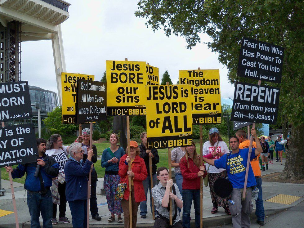 Halfway down the street of art booths, a small group of individuals caught my attention with their chanting and their large, colorful signs. I saw the name Jesus plastered on many of the signs, although the text was too small to read at a glance. Their chants were lost among the chatter of the festival, amounting to as little as white noise. The one sign that caught my eye, really the one sign I could make out, read in bold and in all-caps: